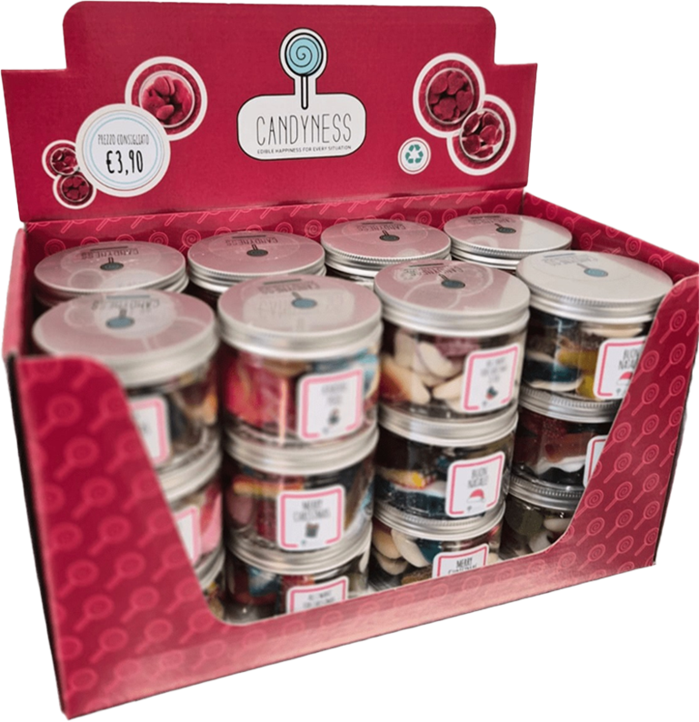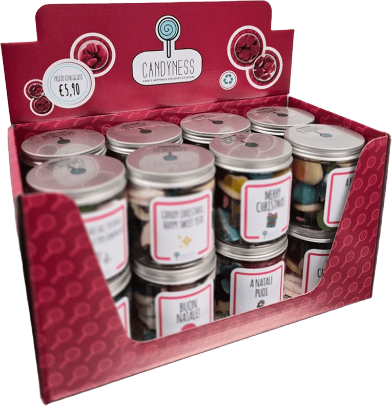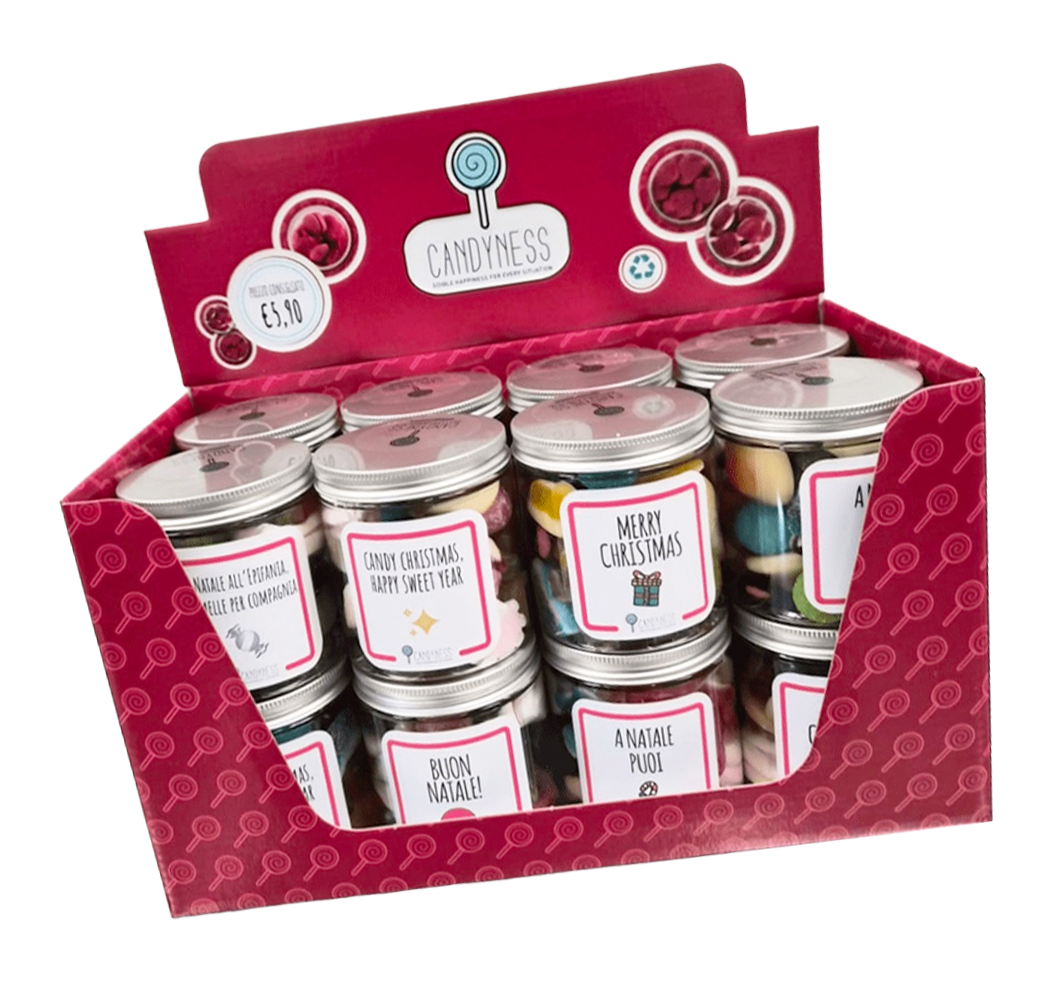 Le box Candyness Christmas Mix sono già disponibili nell’espositore da banco, comprendono una selezione di 10 caramelle gommose top seller in eleganti e simpatici barattoli con adesivi a tema natalizio. Sono il prodotto ideale per chi è a caccia di idee regalo veloci, divertenti, convenienti ma d’impatto.